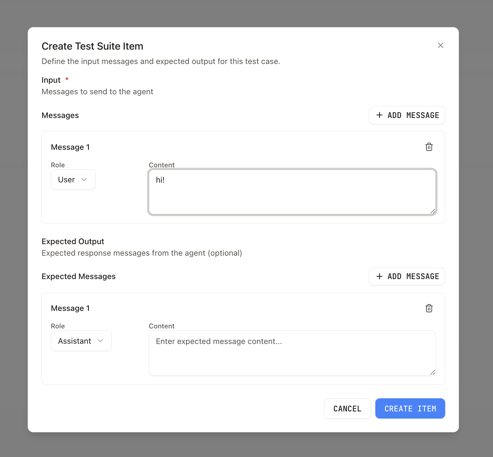 messagesarray. Each message has arole(user,assistant, orsystem) andcontentin the same shape as chat messages elsewhere in the product (for exampletextstrings, orpartsfor richer content). This is what the agent sees when the item is run. - Expected output (optional) — JSON array of messages with the same role/content shape. Use it to record the reference reply you care about; evaluators or your own tooling can compare model output to this.